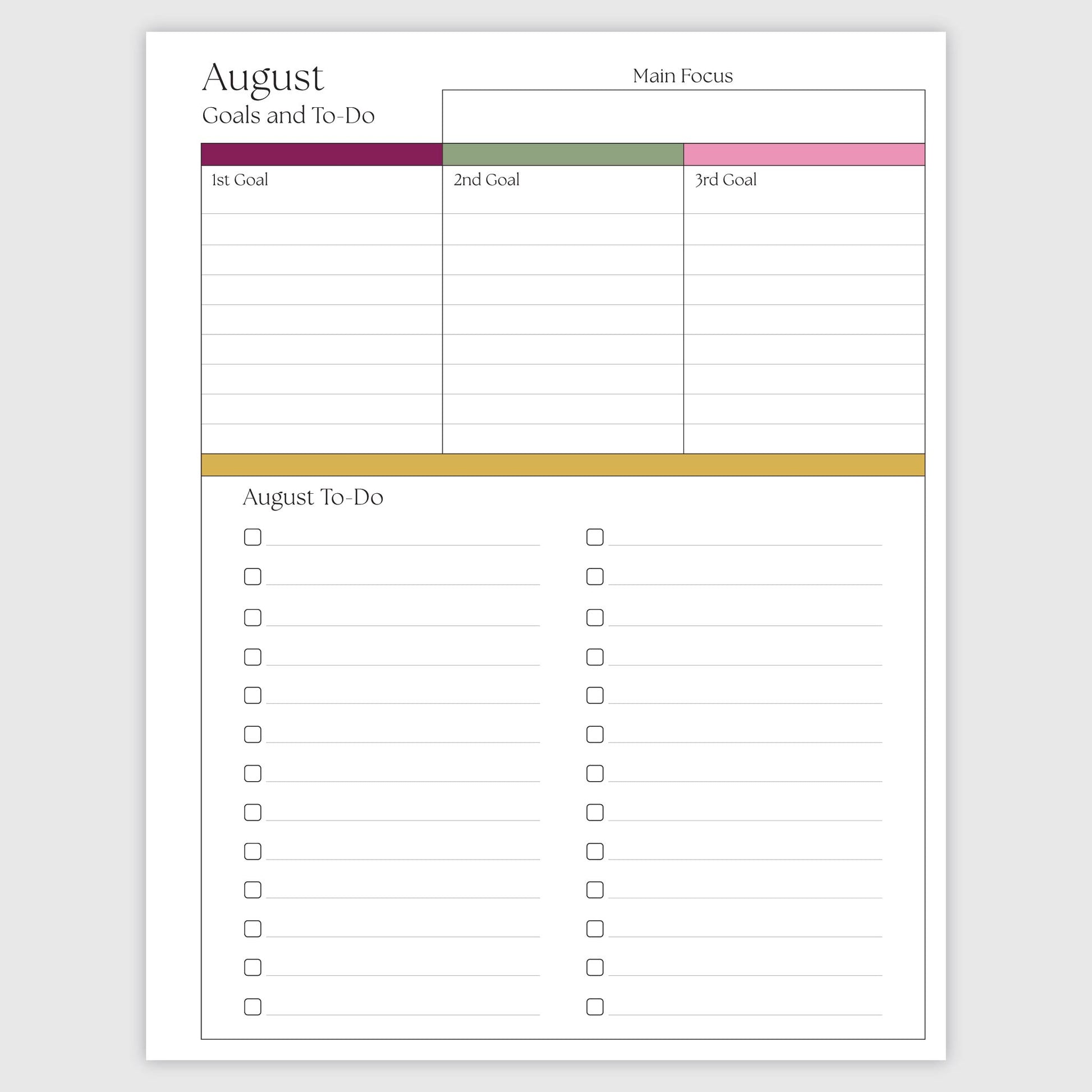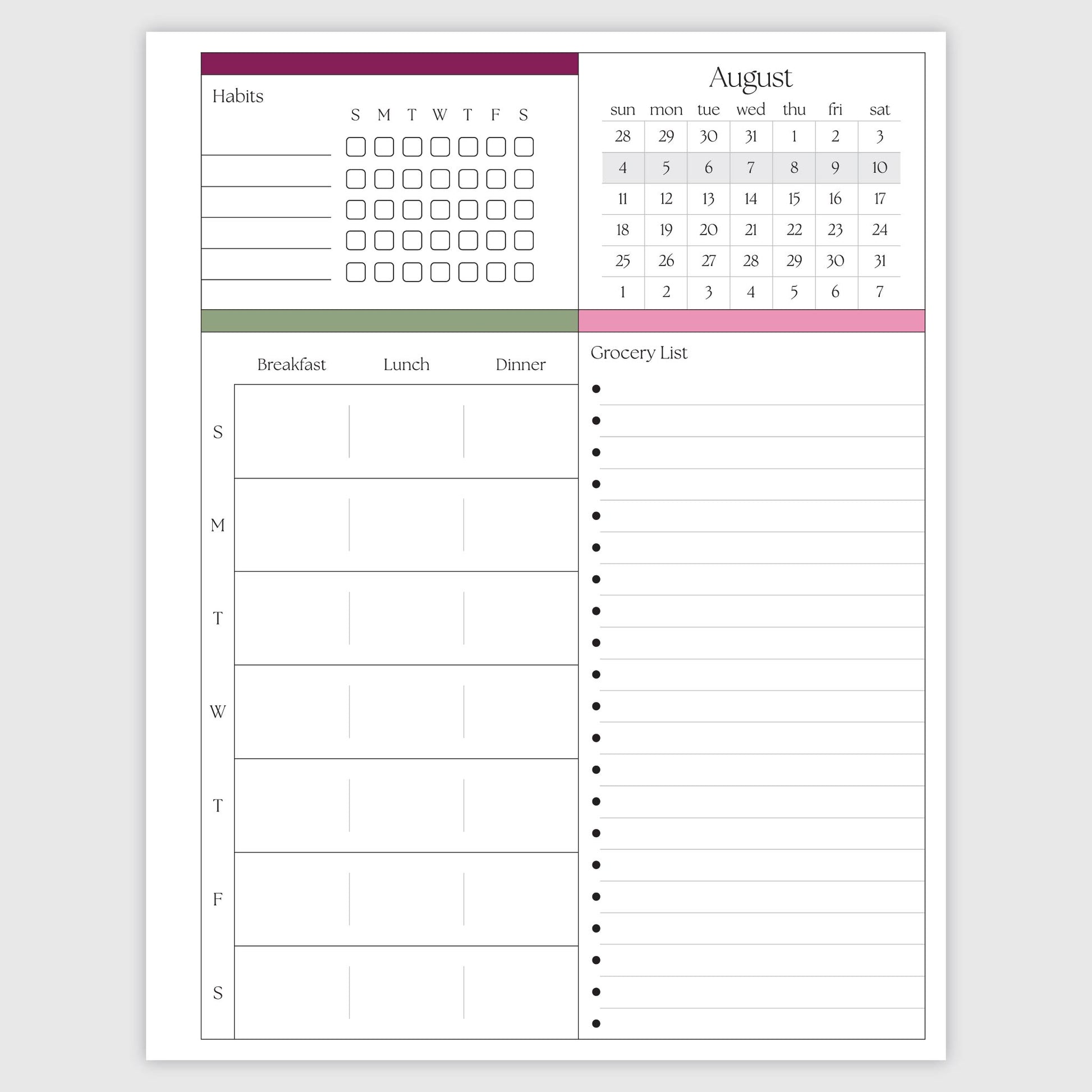 Our Works planner also includes a main holiday list in the front, holidays listed on each individual day, a vision board, a goal and to-do list for every month, two page monthly spread for every month, budgeting page for every month, meal prep/grocery list for every week, weekly outlook, habit tracking, hydration tracking, future 12 month tracking, password tracker, contact tracker and numerous additional note pages.
