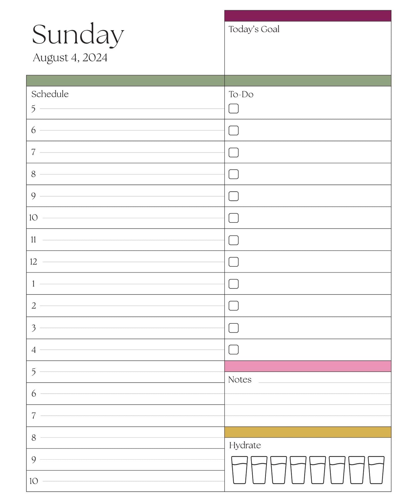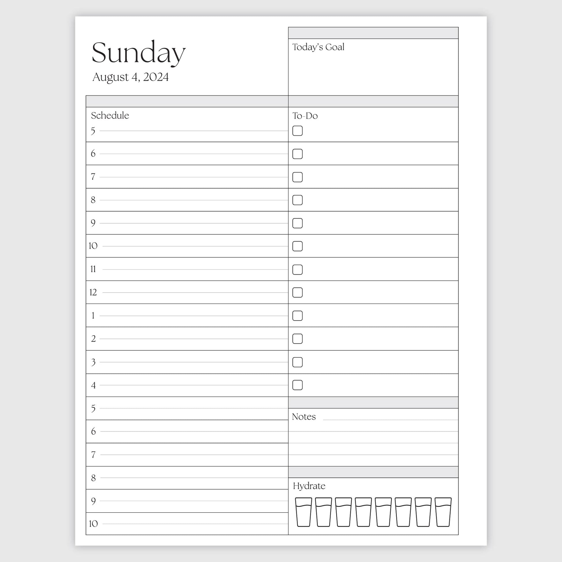 Our Works Daily planner is 6 months in length and can be purchased with any start month. It features full pages for every day, including a 5am to 10pm hourly breakdown, individual daily goals, hydration tracking and To-Do list.