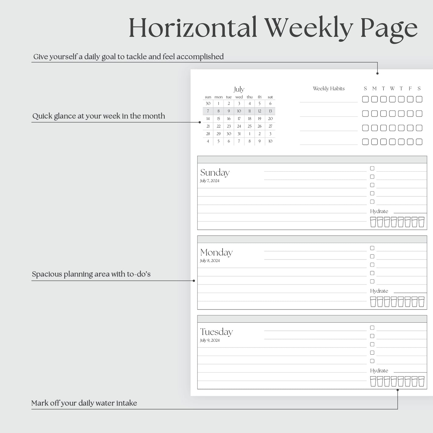 Our Works Horizontal Weekly planner is 12 months in length and can be purchased with any start month. It features a horizontal layout.